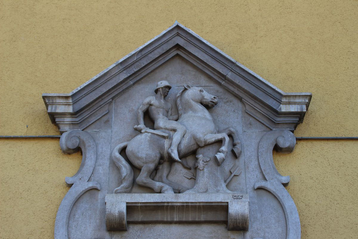 Ein großformatiges Sandsteinrelief Gründung der Universität, mit der Göttin Pallas Athene,
