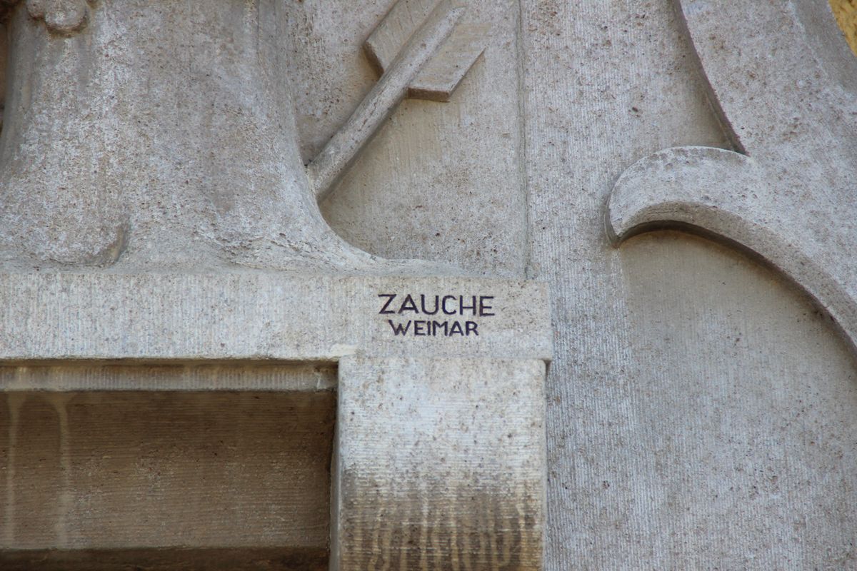 1908 zur Einweihung der Friedrich-Schiller-Universität Jena (Supraporte an der Nordwand des kleinen Innenhofes des Hauptgebäudes). Eine etwa einen Meter große Plastik Fußballspielergruppe von Zauche stand zuletzt in der Bibliothek der Landesturnanstalt Jena (heute Institut für Sportwissenschaften der Universität). Sie wurde im April 1940 auf Antrag des damaligen Institutsdirektors Ernst Herberger angefertigt.